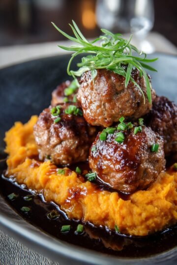 - Pork Meatballs with Sweet Potato Mash & Bourbon-Maple Sauce