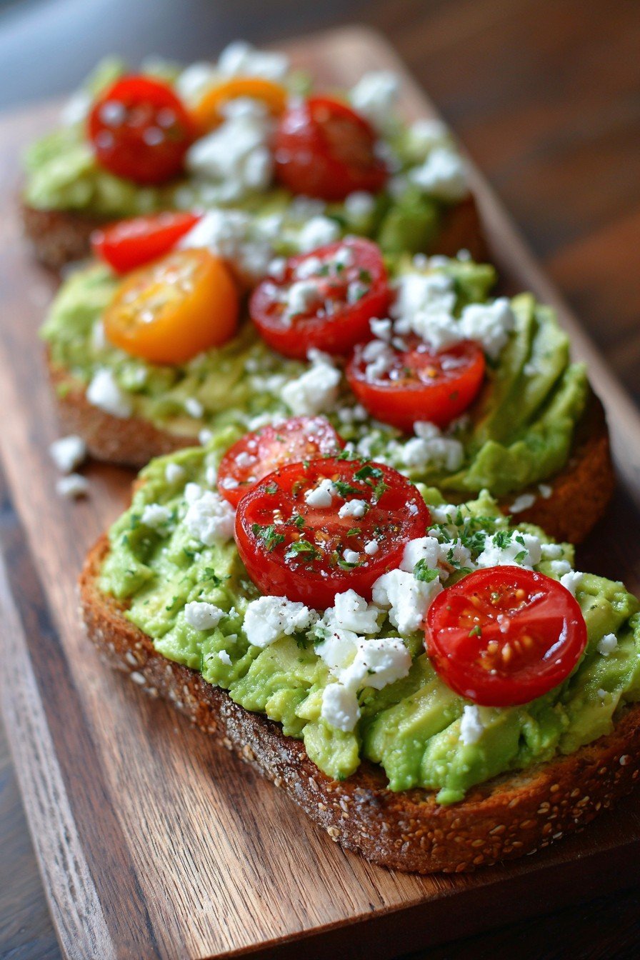 4Spread the mashed avocado evenly over the toasted bread slices. Top generously with crumbled feta cheese, followed by a generous spoonful of the marinated cherry tomatoes.