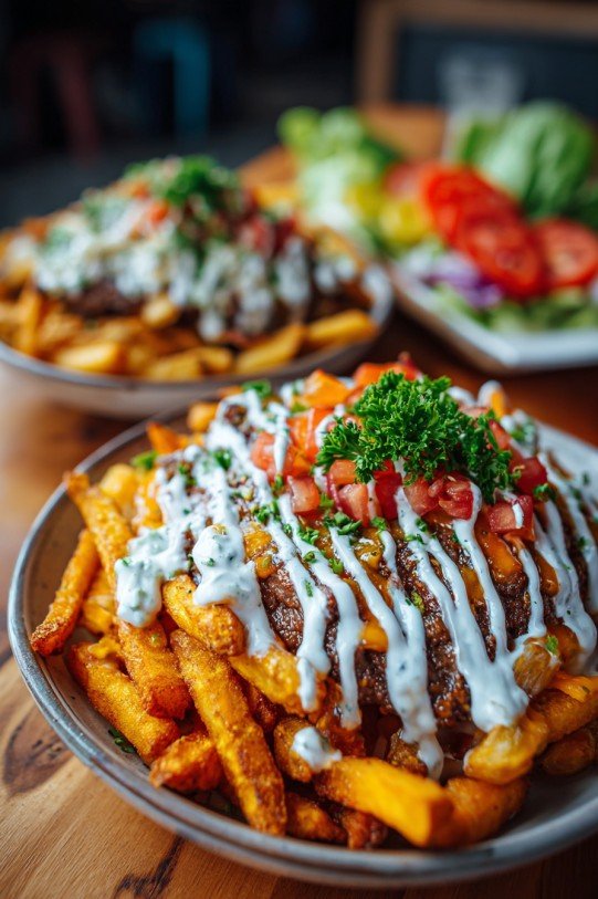 Store leftover beef, toppings, and sauces in separate airtight containers in the refrigerator for up to 4 days. Fries are best enjoyed fresh, but can be reheated in a 400°F (200°C) oven for 5-7 minutes. Do not freeze assembled bowls for best texture.