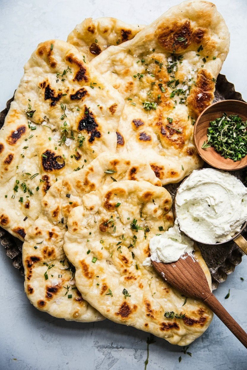 - Spread a generous layer of whipped garlic feta over each warm pita.