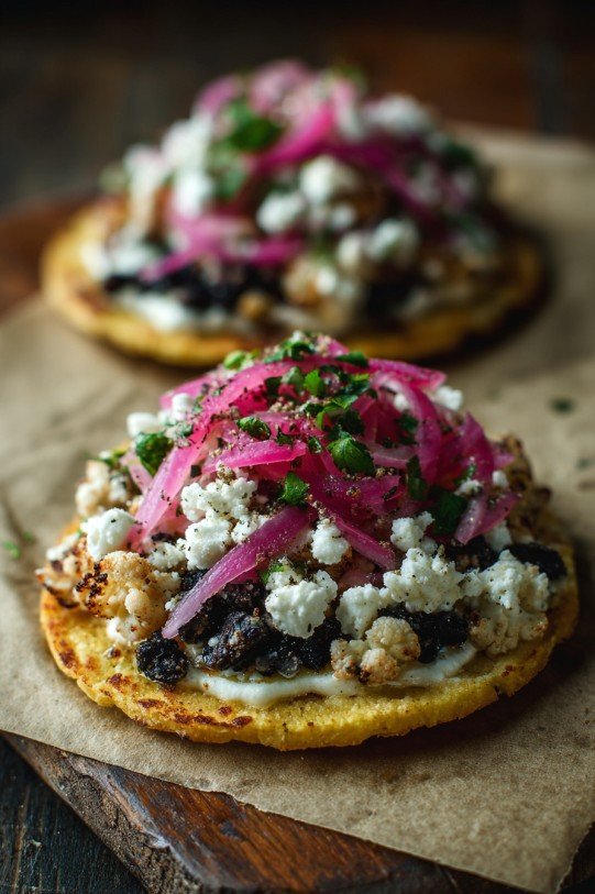 Cauliflower Black Bean Tostadas with Queso and Pickled Onion