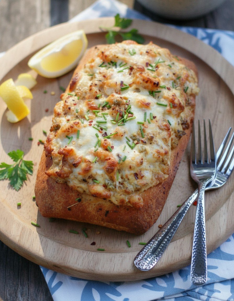 - Top and Bake: Spoon the cheesy shrimp mixture evenly over both bread halves. Bake in the preheated oven for 12-15 minutes, or until the cheese is bubbly and golden.