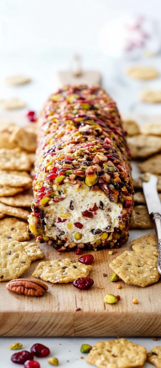 4Spread the chopped pistachios evenly on a clean surface. Unwrap the chilled cheese log and gently roll it in the pistachios, pressing lightly so they adhere all over.