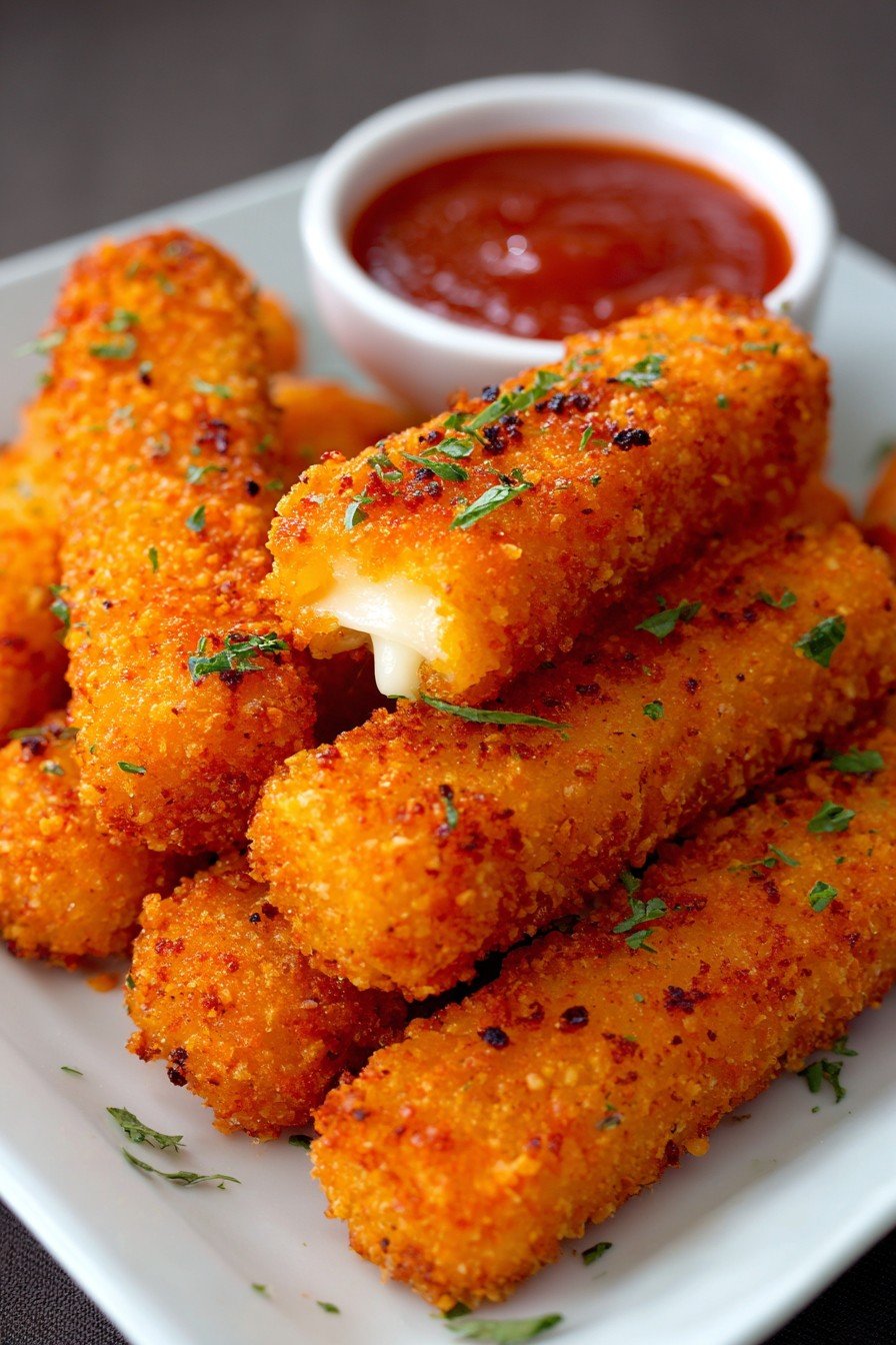 Store leftover mozzarella sticks in an airtight container in the refrigerator for up to 3 days. Reheat in an oven or air fryer at 375°F (190°C) until hot and crispy. For longer storage, freeze uncooked breaded sticks up to 2 months—just fry straight from the freezer!