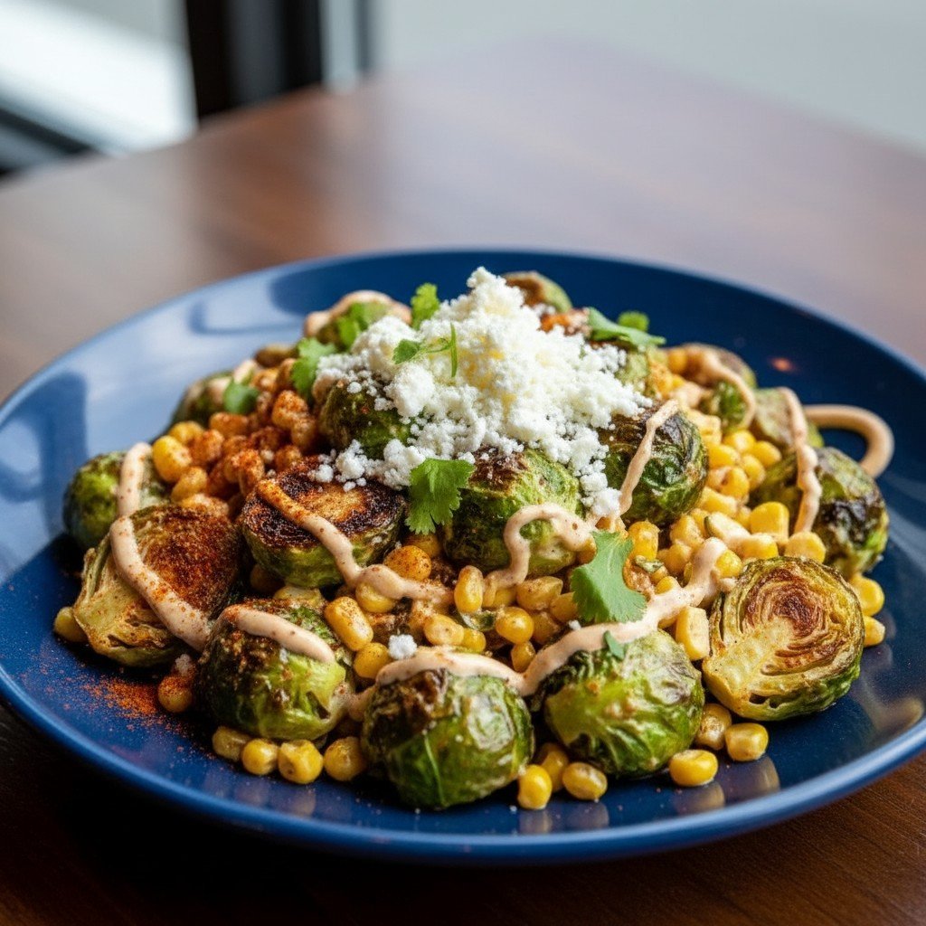 - Transfer roasted Brussels sprouts and corn to a large bowl. Drizzle with street corn sauce and toss to coat evenly.