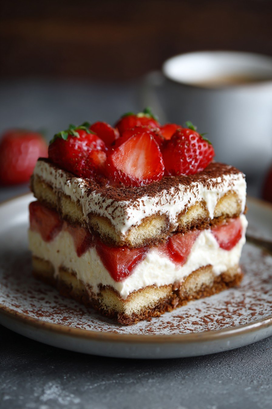 Cover leftover No-Bake Layered Strawberry Tiramisu Dessert tightly and store in the refrigerator for up to 3 days. For best texture and freshness, avoid freezing as the creamy layers may separate when thawed.