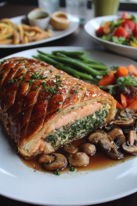 - The mushroom duxelles add deep, savory flavor that pairs perfectly with rich salmon.