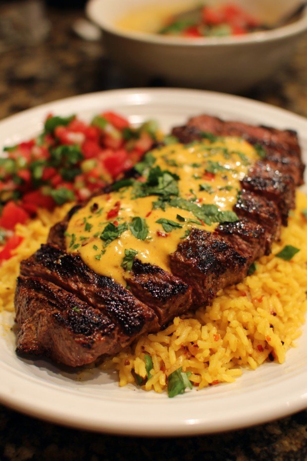 - Creamy queso melds perfectly with juicy steak and fluffy rice.
