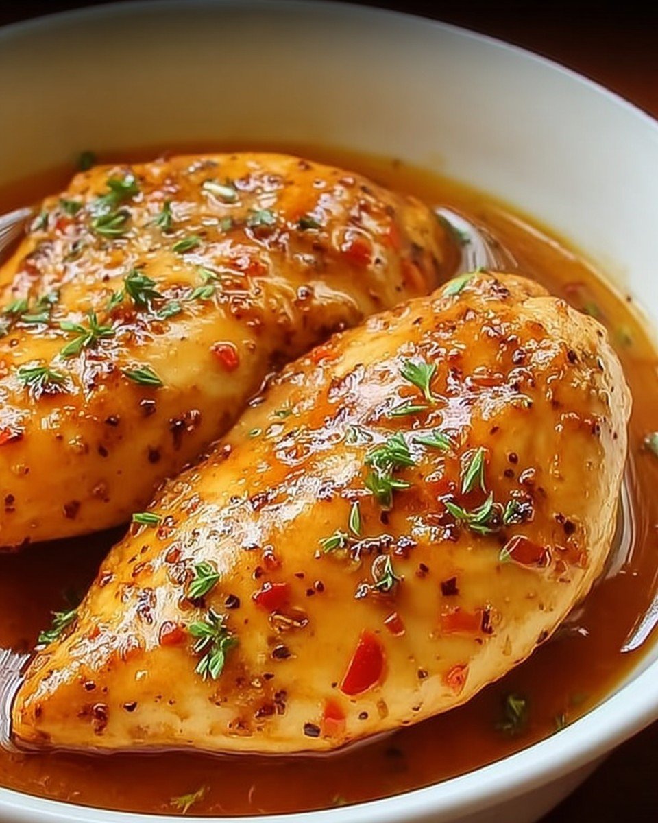3Pour the sauce mixture evenly over the chicken breasts in the crockpot.